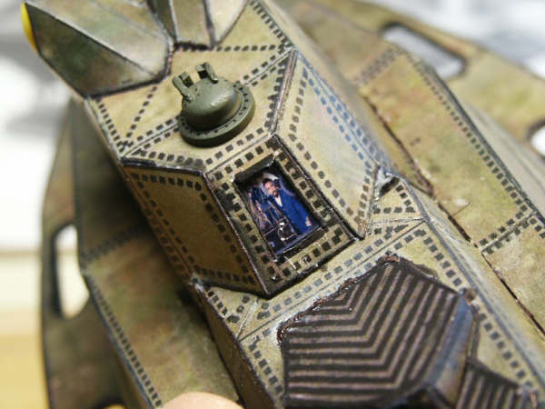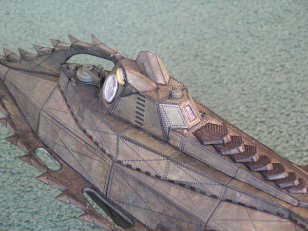 -Paint. A q-tip and watered down mixture of 7/8” black/1/8” green water-based paint, “white-washing” along the hull then wiped with a paper towel or cloth, does a great job of coloring all the cuts, folds, glue marks and scratches on your sub and gives the Nautilus a nice darker tone. A great way to finish your model is to give